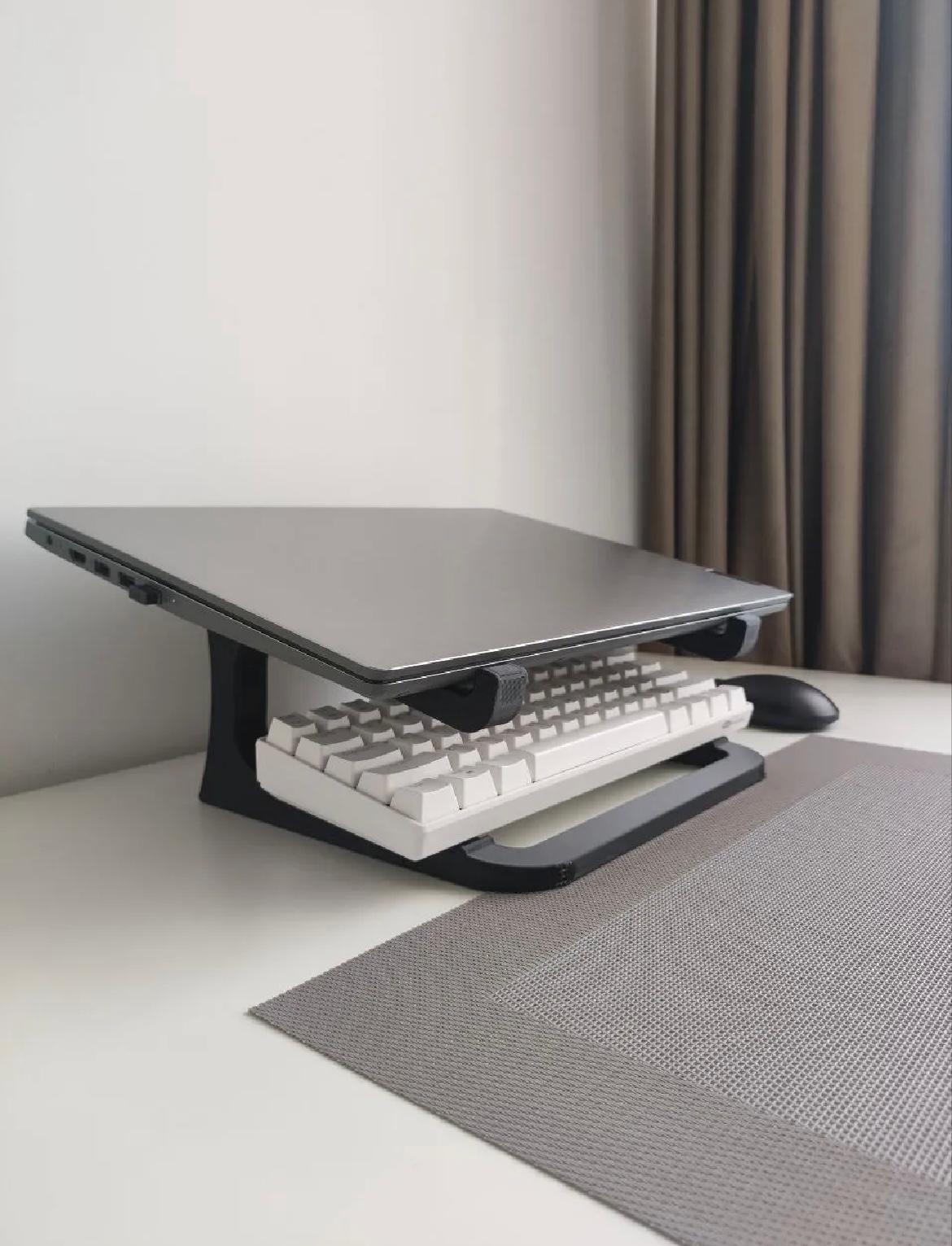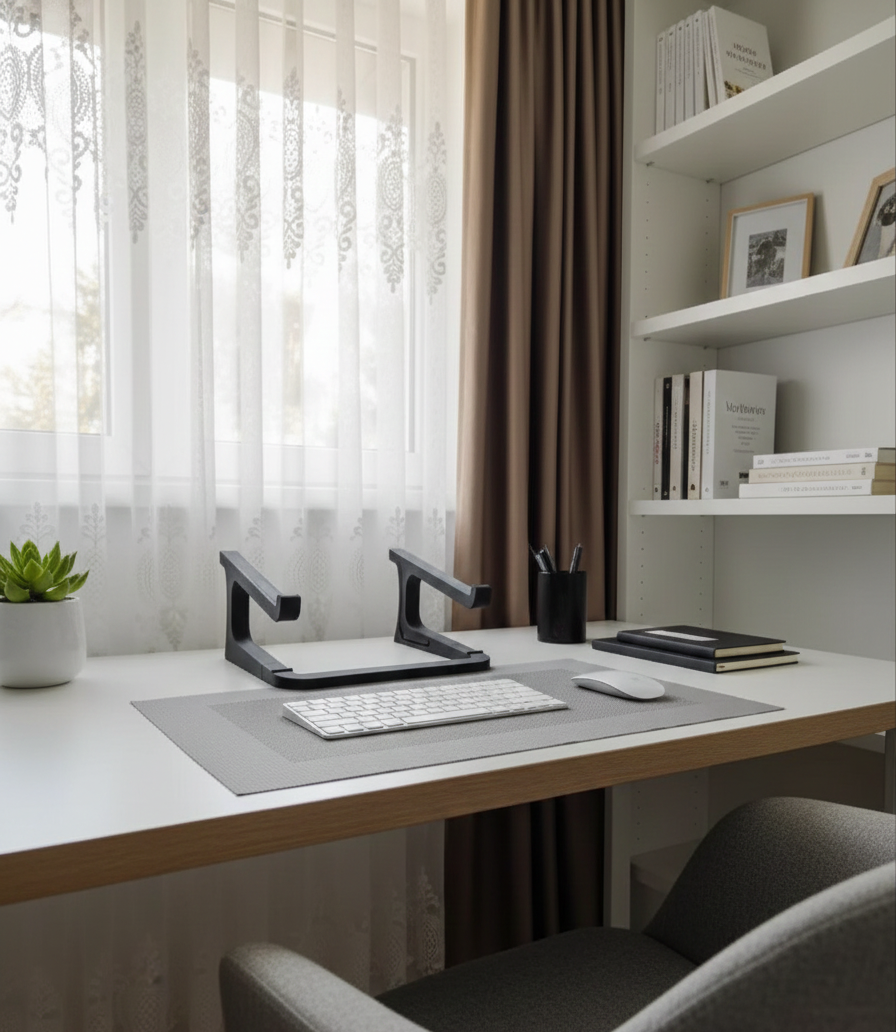 La altura y la base están perfectamente dimensionadas para permitir que el teclado u otros accesorios se almacenen justo debajo del portátil cuando no estén en uso. Esto te permite recuperar un área valiosa de tu escritorio, transformándolo en un espacio de trabajo limpio, ordenado y visualmente despejado. Además, al elevar la pantalla a una altura más cómoda, el soporte permite una postura ergonómica, ayudando a reducir la tensión en el cuello y los hombros durante largas jornadas de trabajo.